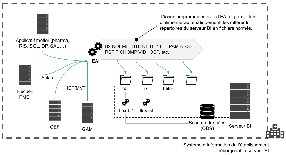 La production des fichiers est à la charge du système connecté à la plate-forme BI. Ces fichiers sont généralement produits par un EAI (Enterprise Application Integration) dans les établissements (Antares… Enovacom, Cloverleaf ) ou directement par les éditeurs des logiciels.